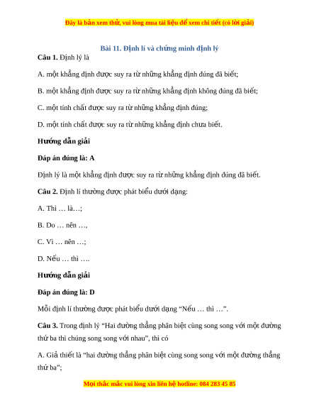 Đây là bản xem th , vu ử i lòng mua tài li u ệ đ xe ể m chi ti t (c ế ó l i ờ gi i ả ) Bài 11. Đ nh l ị í và ch ng m ứ inh đ nh l ị ý Câu 1. Định lý là A. m t ộ kh ng ẳ đ nh đ ị ư c s ợ uy ra t nh ừ ng kh ữ ng đ ẳ nh đúng đã bi ị t ế ; B. m t ộ kh ng đ ẳ nh đ ị ư c ợ suy ra t nh ừ ng kh ữ ng ẳ đ nh không đúng đã ị bi t ế ; C. m t ộ tính ch t ấ được suy ra t nh ừ ng ữ kh ng đ ẳ nh đúng; ị D. m t ộ tính ch t ấ đư c ợ suy ra t nh ừ ng kh ữ ng ẳ đ nh ch ị a ư bi t ế . Hư ng d ớ ẫn gi i ả Đáp án đúng là: A Định lý là m t ộ kh ng ẳ đ nh đ ị ược suy ra t nh ừ ng ữ kh ng đ ẳ nh đúng đã bi ị t ế .