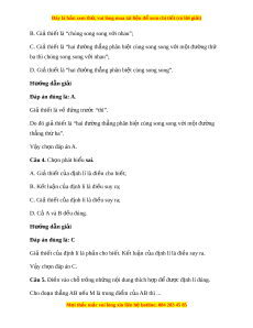 Đáp án đúng là: A. Giả thi t ế là v đ ế ng t ứ rư c “t ớ hì”. Do đó giả thi t ế là “hai đư ng t ờ h ng ẳ phân bi t ệ cùng song song v i ớ m t ộ đư ng ờ th ng ẳ th ba”. ứ V y ậ ch n đáp án ọ A. Câu 4. Ch n ọ phát bi u ể sai. A. Giả thi t ế c a đ ủ nh l ị í là đi u cho bi ề t ế ; B. K t ế lu n c ậ a ủ định lí là đi u ề suy ra; C. Gi t ả hi t ế c a ủ đ nh l ị í là đi u s ề uy ra; D. C ả A và B đ u đúng ề . Hư ng d ớ ẫn gi i ả Đáp án đúng là: C Giả thi t ế c a đ ủ nh l ị í là ph n cho bi ầ t ế . K t ế lu n c ậ a ủ đ nh l ị í là đi u ề suy ra. V y ậ ch n đáp án ọ C. Câu 5. Đi n vào ề chỗ tr ng nh ố ng n ữ i ộ dung thích h p đ ợ đ ể ư c ợ đ nh l ị í đúng. Cho đo n t ạ h ng ẳ AB n u ế M là trung đi m ể c a ủ AB thì ... M i