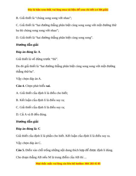 Câu 3. Trong định lý “Hai đư ng t ờ h ng ẳ phân bi t ệ cùng song song v i ớ m t ộ đư ng ờ th ba ứ thì chúng song song v i ớ nhau”, thì có A. Giả thi t ế là “hai đư ng ờ th ng ẳ phân bi t ệ cùng song song v i ớ m t ộ đư ng ờ th ng ẳ th ba”; ứ M i
