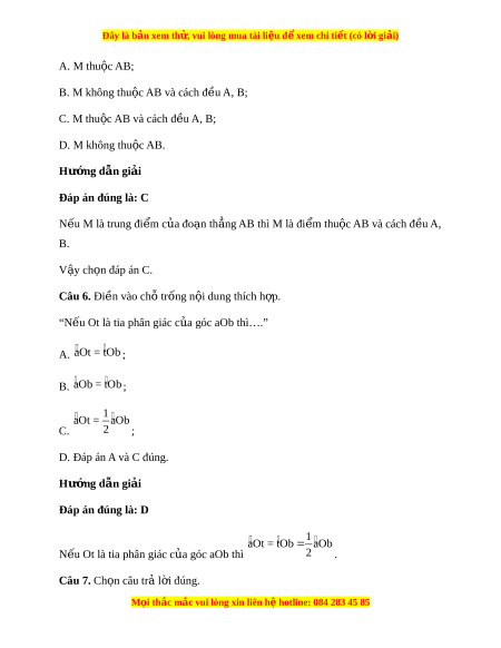 Đây là bản xem th , vu ử i lòng mua tài li u ệ đ xe ể m chi ti t (c ế ó l i ờ gi i ả ) A. M thu c ộ AB; B. M không thu c ộ AB và cách đ u ề A, B; C. M thu c ộ AB và cách đ u ề A, B; D. M không thu c ộ AB. Hư ng d ớ ẫn gi i ả Đáp án đúng là: C N u ế M là trung đi m ể c a đo ủ n ạ th ng ẳ AB thì M là đi m ể thu c ộ AB và cách đ u ề A, B. V y ậ ch n đáp án ọ C. Câu 6. Đi n vào ề chỗ tr ng n ố i ộ dung thích h p. ợ “N u ế Ot là tia phân giác c a ủ góc aOb thì….” A. aOt = tOb ; B. aOb = tOb ; 1 aOt = aOb C. 2 ; D. Đáp án A và C đúng. Hư ng d ớ ẫn gi i ả Đáp án đúng là: D 1 aOt = tOb aOb N u ế Ot là tia phân giác c a ủ góc aOb thì 2 . Câu 7. Ch n ọ câu tr l ả i ờ đúng. M i