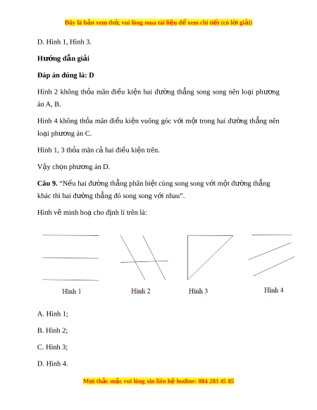 ẳ song song thì nó vuông góc v i ớ đư ng t ờ h ng ẳ còn l i ạ ”. Hình v m ẽ inh ho cho ạ đ nh l ị í trên là: A. Hình 1, Hình 2; B. Hình 2, Hình 3; C. Hình 3, Hình 4; M i