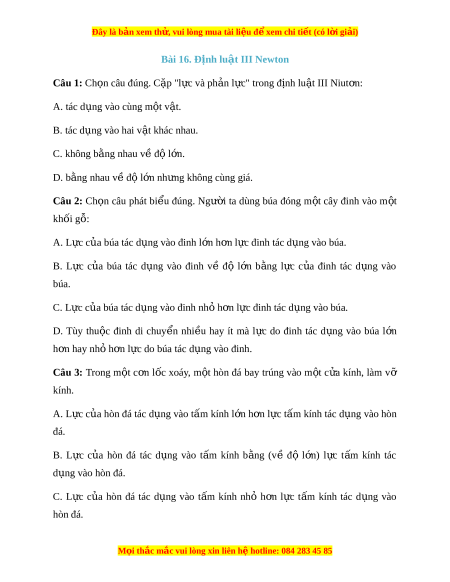 Đây là bản xem th , vu ử i lòng mua tài li u ệ đ xe ể m chi ti t (c ế ó l i ờ gi i ả ) Bài 16. Đ nh l ị u t ậ III Newton Câu 1: Ch n câu ọ đúng. C p ặ "l c và ph ự n ả l c" ự trong đ nh l ị u t ậ III Niut n: ơ A. tác d ng vào cùng m ụ t ộ v t ậ . B. tác d ng vào hai ụ v t ậ khác nhau. C. không b ng nhau v ằ ề đ l ộ n. ớ D. b ng ằ nhau v đ ề l ộ n ớ nh ng không cùng gi ư á. Câu 2: Ch n ọ câu phát bi u ể đúng. Ngư i ờ ta dùng búa đóng m t ộ cây đinh vào m t ộ khối g : ỗ A. L c c ự a ủ búa tác d ng vào đi ụ nh l n ớ h n l ơ c đi ự nh tác d ng vào ụ búa. B. L c ự c a ủ búa tác d ng ụ vào đinh về độ l n ớ b ng ằ l c ự c a ủ đinh tác d ng ụ vào búa. C. L c ự c a búa t ủ ác d ng ụ vào đinh nh h ỏ n l ơ c đi ự nh tác d ng vào búa. ụ D. Tùy thu c ộ đinh di chuy n ể nhi u ề hay ít mà l c ự do đinh tác d ng ụ vào búa l n ớ h n ơ hay nh h ỏ n l ơ c do búa ự tác d ng vào đi ụ nh. Câu 3: Trong m t ộ c n ơ l c ố xoáy, m t
