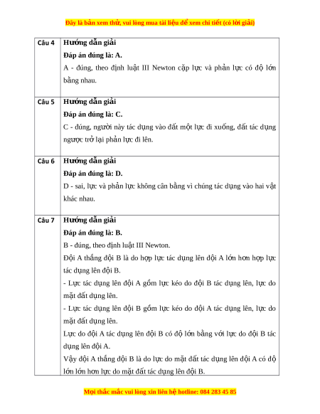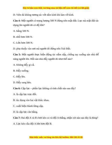 Đây là bản xem th , vu ử i lòng mua tài li u ệ đ xe ể m chi ti t (c ế ó l i ờ gi i ả ) D. Viên đá không tư ng t ơ ác v i ớ t m ấ kính khi làm v kí ỡ nh. Câu 4: M t ộ ngư i ờ có tr ng ọ lư ng ợ 500 N đ ng ứ trên m t ặ đ t ấ . L c ự mà m t ặ đ t ấ tác d ng l ụ ên ngư i ờ đó có đ l ộ n? ớ A. b ng ằ 500 N. B. nh h ỏ n 500 N ơ . C. L n h ớ n ơ 500 N. D. phụ thu c ộ vào n i ơ mà ngư i ờ đó đ ng t ứ rên Trái Đ t ấ . Câu 5: M t ộ ngư i ờ th c ự hi n ệ đ ng ộ tác n m ằ s p, ấ ch ng ố tay xu ng ố sàn nhà để nâng ngư i ờ lên. H i ỏ sàn nhà đ y ng ẩ ư i ờ đó nh t ư h nào? ế A. Không đẩy gì c . ả B. Đẩy xuống. C. Đẩy lên. D. Đẩy sang bên. Câu 6: C p ặ l c – ph ự n l ả c ự không có tính ch t ấ nào sau đây? A. là c p l ặ c t ự r c đ ự ối. B. tác d ng vào hai ụ v t ậ khác nhau. C. xu t ấ hi n t ệ hành t ng c ừ p. ặ D. là c p l ặ c cân ự b ng. ằ Câu 7: Hai đ i ộ A và B ch i ơ kéo co và đ i ộ A th ng, nh ắ n