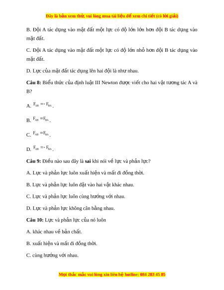 Đây là bản xem th , vu ử i lòng mua tài li u ệ đ xe ể m chi ti t (c ế ó l i ờ gi i ả ) B. Đ i ộ A tác d ng ụ vào m t ặ đ t ấ m t ộ l c ự có độ l n ớ l n ớ h n ơ đ i ộ B tác d ng ụ vào m t ặ đất. C. Đ i ộ A tác d ng ụ vào m t ặ đ t ấ m t ộ l c ự có độ l n ớ nhỏ h n ơ đ i ộ B tác d ng ụ vào m t ặ đất. D. L c c ự a ủ m t ặ đ t ấ tác d ng l ụ ên hai đ i ộ là nh nhau. ư Câu 8: Bi u ể th c ứ c a ủ đ nh ị lu t ậ III Newton đư c ợ vi t ế cho hai v t ậ tư ng ơ tác A và B? A. F F AB BA . B. F F AB BA . C. F F AB BA . D. F F AB BA . Câu 9: Đi u nào s ề