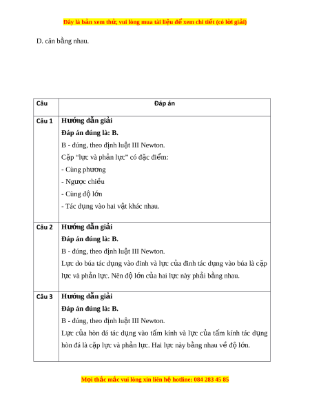 Đây là bản xem th , vu ử i lòng mua tài li u ệ đ xe ể m chi ti t (c ế ó l i ờ gi i ả ) D. cân b ng nhau. ằ Câu Đáp án Câu 1 Hư ng d ớ ẫn gi i ả