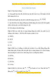 Đây là bản xem th , vu ử i lòng mua tài li u ệ đ xe ể m chi ti t ế (có l i ờ gi i ả ) Bài 23. Đ nh l ị u t ậ Hooke Câu 1: Ch n ọ đáp án đúng. A. Trong gi i ớ h n ạ đàn h i ồ , độ l n ớ l c ự đàn h i ồ c a ủ lò xo tỉ lệ thu n ậ v i ớ độ bi n d ế ng c ạ a ủ lò xo. B. Mối liên h gi ệ a l ữ c ự đàn h i ồ và đ bi ộ n d ế ng c ạ a ủ lò xo: F k . l dh . C. L c ự đàn h i ồ có tác d ng ụ ch ng l ố i ạ s bi ự n ế d ng ạ c a ủ v t ậ , do đó luôn ngư c ợ chi u v ề i ớ l c gây ự ra s bi ự n d ế ng ạ cho v t ậ .