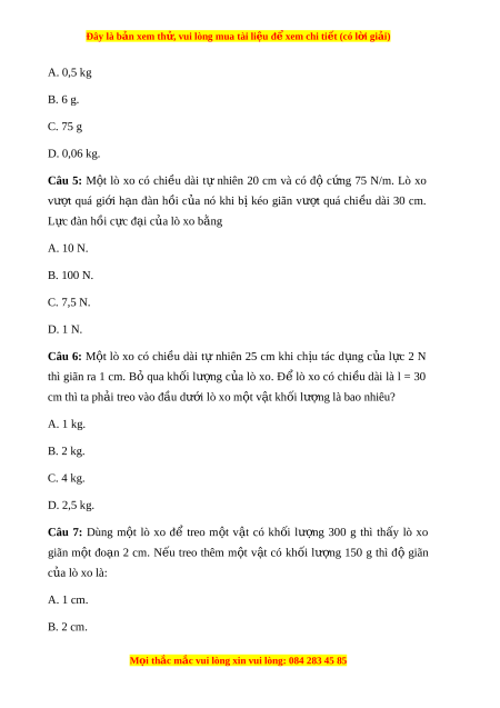 Đây là bản xem th , vu ử i lòng mua tài li u ệ đ xe ể m chi ti t (c ế ó l i ờ gi i ả ) A. 0,5 kg B. 6 g. C. 75 g D. 0,06 kg. Câu 5: M t ộ lò xo có chi u