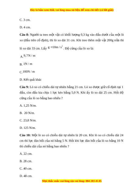 Đây là bản xem th , vu ử i lòng mua tài li u ệ đ xe ể m chi ti t ế (có l i ờ gi i ả ) C. 3 cm. D. 4 cm. Câu 8: Ngư i ờ ta treo m t ộ v t ậ có kh i ố lư ng ợ 0,3 kg vào đ u ầ dư i ớ c a ủ m t ộ lò xo (đ u ầ trên cố đ nh) ị