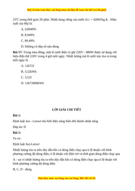 Bài 1: Định luật Jun-Lenxơ cho biết điện năng biến đổi thành: A. Cơ năng B. Năng lượng ánh sáng C. Hóa năng D. Nhiệt năng