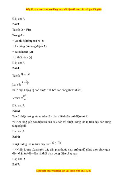 Bài 3: Biểu thức nào sau đây là công thức tính nhiệt lượng tỏa ra trên dây dẫn khi có