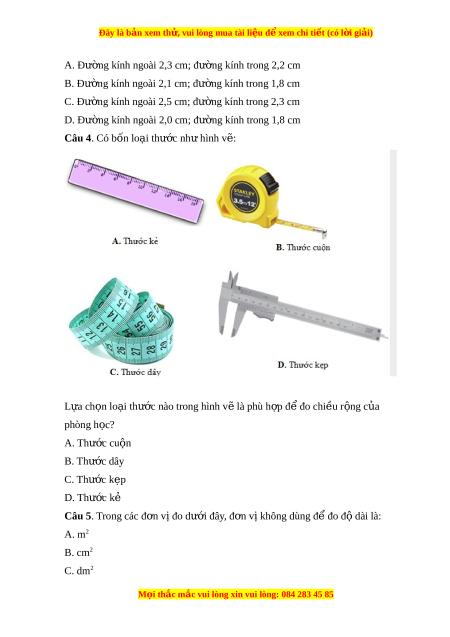 ờ kính ngoài 2,5 cm; đư ng kí ờ nh trong 2,3 cm D. Đư ng kí ờ nh ngoài 2,0 cm; đư ng ờ kính trong 1,8 cm Câu 4. Có bốn lo i ạ thư c ớ nh hì ư nh v : ẽ L a ự ch n l ọ o i ạ thư c ớ nào trong hình v l ẽ à phù h p ợ đ đo chi ể u r ề ng c ộ a ủ phòng h c? ọ A. Thư c cu ớ n ộ B. Thư c ớ dây C. Thư c ớ kẹp D. Thư c k ớ ẻ