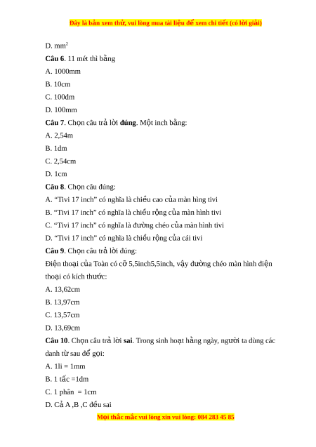 Câu 6. 11 mét thì b ng ằ A. 1000mm B. 10cm C. 100dm D. 100mm Câu 7. Ch n câu ọ trả l i ờ đúng. M t ộ inch b ng: ằ A. 2,54m B. 1dm C. 2,54cm D. 1cm Câu 8. Ch n câu ọ đúng: