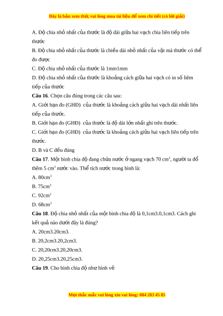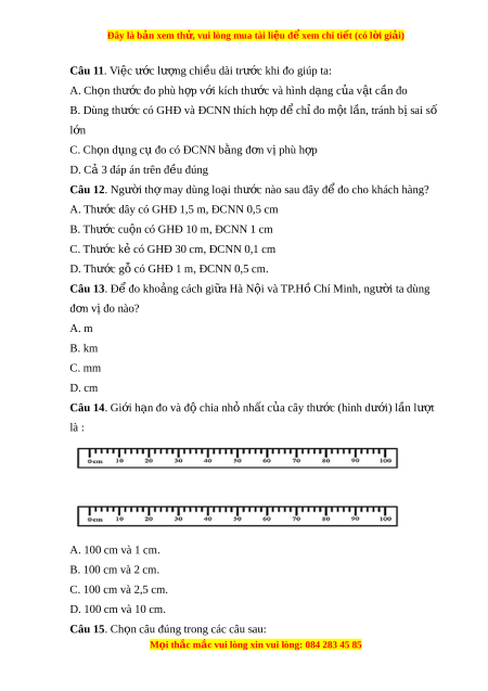 Đây là bản xem th , vu ử i lòng mua tài li u ệ đ xe ể m chi ti t ế (có l i ờ gi i ả ) Câu 11. Việc ư c ớ lư ng chi ợ u ề dài trư c ớ khi đo giúp ta: A. Ch n t ọ hư c ớ đo phù h p v ợ i ớ kích thư c ớ và hình d ng ạ c a v ủ t ậ c n đo ầ B. Dùng thư c