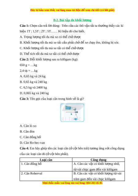 Đây là bản xem th , vu ử i lòng mua tài li u ệ đ xe ể m chi ti t ế (có l i ờ gi i ả ) B .2. B ài tập đo kh i ố lư ng ợ Câu 1: Ch n ọ câu tr l ả i ờ đúng: Trên c a các ử ôtô v n t ậ i ả ta thư ng ờ th y các ấ kí