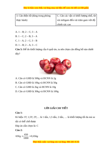 Đây là bản xem th , vu ử i lòng mua tài li u ệ đ xe ể m chi ti t ế (có l i ờ gi i ả ) 3. Cân điện t ( ử dùng trong phòng C. Cân các v t ậ có kh i ố lư ng ợ nh , t ỏ ừ th c hành) ự vài miligam đ n vài ế trăm gam v i ớ độ chính xác cao A. 1 – B; 2 – C; 3 – A B. 1 – C; 2 – B; 3 – A C. 1 – A; 2 – C; 3 – B D. 1 – B; 2 – A; 3 – C