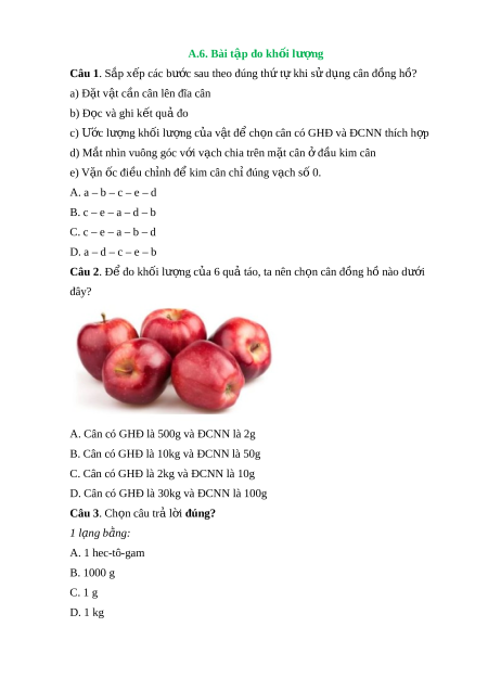 ọ cân có GHĐ và ĐCNN thích h p ợ d) M t ắ nhìn vuông góc v i ớ v ch chi ạ a trên m t ặ cân đ ở u ki ầ m cân e) V n ặ c đi ố u ề ch nh đ ỉ ể kim cân ch đúng v ỉ ch s ạ ố 0. A. a – b – c – e – d B. c – e – a – d – b C. c – e – a – b – d D. a – d – c – e – b Câu 2. Đ đo kh ể ối lư ng c ợ a 6 qu ủ ả táo, ta nên ch n ọ cân đ ng h ồ nào ồ dư i ớ đây?