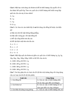 ớ đây là sai khi dùng cân đồng hồ ho c ặ cân đi n ệ t ? ử a) Đ t ặ cân trên b m ề t ặ không b ng ph ằ ng ẳ b) Đ t ặ m t ắ vuông góc v i ớ m t ặ đ ng h ồ ồ c) Đ v ể t ậ cồng k nh t ề rên đĩa cân d) Để v t ậ lệch m t ộ bên trên đĩa cân A. a – b – c B. a – c – d C. b – c – d D. a – b – d Câu 6. M t ộ h p ộ qu cân ả Roberval g m ồ các qu cân ả có kh i ố lư ng ợ 1g, 2g, 5g,