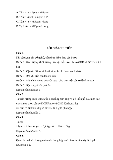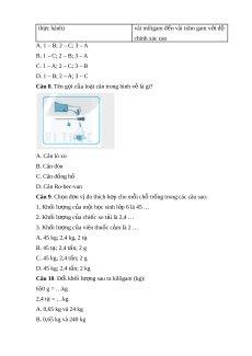 Câu 7. Em hãy ghép tên các lo i ạ cân ( c ở t ộ bên trái) tư ng ơ ng v ứ i ớ công d ng ụ c a các ủ lo i ạ cân đó ( c ở t ộ bên ph i ả ). Loại cân Công d ng ụ 1. Cân đồng hồ A. Cân các v t ậ có kh i ố lư ng nh ợ , ỏ t vài ừ ch c gam ụ đ n vài ế kilôgam 2. Cân Roberval B. Cân các v t ậ có kh i ố lư ng ợ t vài ừ trăm gam đ n ế vài ch c ki ụ lôgam 3. Cân điện t ( ử dùng trong phòng C. Cân các v t ậ có kh i ố lư ng ợ nh , t ỏ ừ th c hành) ự vài miligam đ n vài ế trăm gam v i ớ độ chính xác cao A. 1 – B; 2 – C; 3 – A B. 1 – C; 2 – B; 3 – A C. 1 – A; 2 – C; 3 – B D. 1 – B; 2 – A; 3 – C Câu 8. Tên g i ọ c a ủ lo i ạ cân trong hình v l ẽ à gì? A. Cân lò xo B. Cân đòn C. Cân đồng hồ D. Cân Ro-bec-van Câu 9. Ch n đ ọ n ơ v đo t ị hích h p ợ cho m i ỗ ch t ỗ r ng t ố rong các câu sau: 1. Kh i ố lư ng ợ c a m ủ t ộ h c ọ sinh l p 6 l ớ à 45 … 2. Kh i ố lư ng ợ c a chi ủ c ế xe t i ả là 2,4 … 3. Kh i ố lư ng ợ c a vi ủ ên thu c c ố m ả là 2 … A. 45 kg; 2,4 kg, 2 tạ B. 45 t ; ạ 2,4 tấn; 2 g C. 45 kg; 2,4 tấn; 2 g D. 45 kg; 2,4 tấn; 2 kg Câu 10. Đ i ổ khối lư ng s ợ au ra kilôgam (kg): 650 g = …kg 2,4 t = …kg ạ A. 0,65 kg và 24 kg B. 0,65 kg và 240 kg C. 6,5 kg và 2400 kg D. 0,065 kg và 240 kg