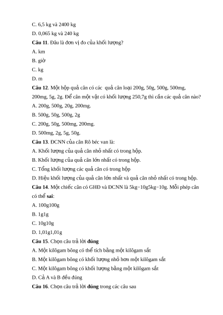 Câu 11. Đâu là đ n v ơ đo c ị a kh ủ ối lư ng? ợ A. km B. giờ C. kg D. m Câu 12. M t ộ h p ộ qu cân ả có các quả cân lo i ạ 200g, 50g, 500g, 500mg, 200mg, 5g, 2g. Đ cân m ể t ộ v t ậ có khối lư ng 250,7g t ợ hì c n các qu ầ cân nào? ả A. 200g, 500g, 20g, 200mg. B. 500g, 50g, 500g, 2g C. 200g, 50g, 500mg, 200mg. D. 500mg, 2g, 5g, 50g. Câu 13. ĐCNN c a ủ cân Rô béc van là: A. Kh i ố lư ng ợ c a qu ủ ả cân nh nh ỏ t ấ có trong h p. ộ B. Khối lư ng c ợ a ủ qu cân ả l n nh ớ t ấ có trong h p. ộ