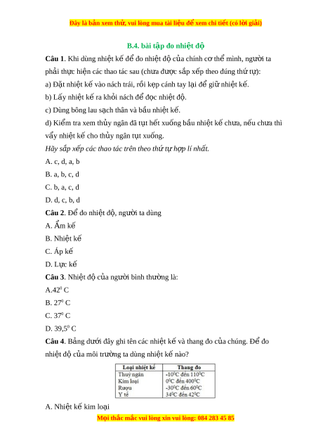 B.4. bài tập đo nhi t ệ độ Câu 1. Khi dùng nhi t ệ kế đ đo nhi ể t ệ độ c a chí ủ nh cơ th m ể ình, ngư i ờ ta ph i ả th c hi ự n các ệ thao tác sau (ch a ư đư c s ợ p x ắ p ế theo đúng th t ứ ) ự : a) Đ t ặ nhi t ệ k vào nách t ế rái, r i ồ k p cánh t ẹ ay l i ạ đ gi ể nhi ữ t ệ k . ế b) Lấy nhiệt k r ế a kh i ỏ nách đ đ ể c nhi ọ t ệ đ . ộ c) Dùng bông lau s ch ạ thân và b u nhi ầ t ệ k . ế d) Ki m ể tra xem th y ngân đã ủ t t ụ h t ế xu ng b ố u nhi ầ t ệ k ch ế a, n ư u ế ch a t ư hì vẩy nhi t ệ k cho ế th y ủ ngân t t ụ xu ng. ố Hãy s p x ắ p các ế