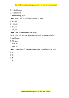 Câu 5. 39,50 C đổi sang đ K ộ envin có giá tr b ị ng: ằ A. 312,5K B. −233,5K C. 233,5K D. 156,25K Câu 6. Đi n t ề còn t ừ hi u vào ch ế ỗ trống: Đ xác đ ể ịnh m c ứ đ nóng, l ộ nh c ạ a ủ v t ậ , ngư i ờ ta dùng khái ni m ệ …. A. khối lư ng ợ B. th i ờ gian C. nhiệt độ D. nhi t ệ kế Câu 7. Đ n v ơ ị đo nhi t ệ đ t ộ hư ng dùng h ờ ng ằ ngày c a n ủ ư c ớ ta là gì? A. 0C B. 0K C. 0F D. m M i