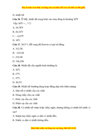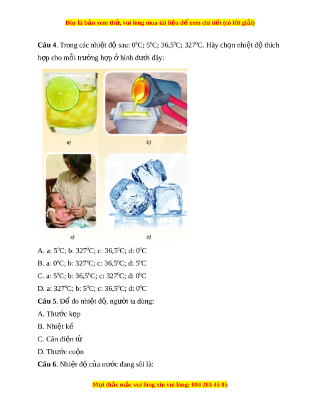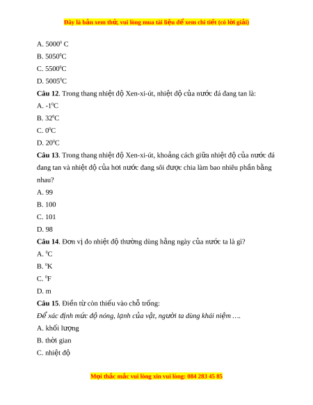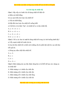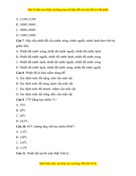 Đây là bản xem th , vu ử i lòng mua tài li u ệ đ xe ể m chi ti t (c ế ó l i ờ gi i ả ) A. 2120C2120C B. 1000C1000C C. 1800C1800C D. 1500C1500C Câu 7. S p ắ x p nhi ế t ệ độ c a n ủ ư c ớ nóng, nư c ngu ớ i ộ , nư c l ớ nh ạ theo th t ứ ự gi m ả dần. A. Nhi t ệ đ n ộ ư c ớ nóng, nhi t ệ đ n ộ ư c ngu ớ i ộ , nhi t ệ đ n ộ ư c l ớ nh ạ B. Nhi t ệ đ n ộ ư c ngu ớ i ộ , nhi t ệ đ n ộ ước l nh, nhi ạ t ệ đ n ộ ư c ớ nóng C. Nhi t ệ đ n ộ ư c l ớ nh, ạ nhi t ệ độ nư c ngu ớ i ộ , nhi t ệ đ n ộ ư c ớ nóng D. Nhi t ệ đ n ộ ư c ớ l nh, nhi ạ t ệ đ n ộ ư c ớ nóng, nhi t ệ đ n ộ ư c ngu ớ i ộ Câu 8. Nhi t ệ đ l ộ à khái ni m ệ dùng đ : ể A. Xác đ nh m ị c ứ đ n ộ ng, nh ặ c ẹ a ủ m t ộ v t ậ B. Xác định m c đ ứ nóng, l ộ nh ạ c a m ủ t ộ v t ậ C. Xác định m c đ ứ nhanh, ộ ch m ậ c a ủ m t ộ v t ậ D. Xác đ nh m ị c ứ đ c ộ ng, d ứ o c ẻ a ủ m t ộ v t ậ
