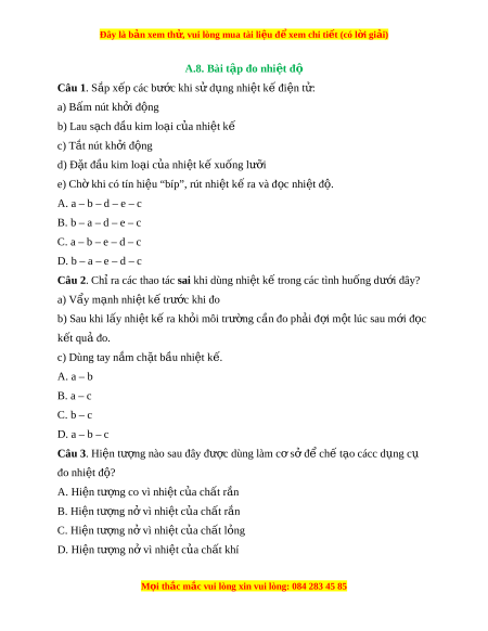 Đây là bản xem th , vu ử i lòng mua tài li u ệ đ xe ể m chi ti t (c ế ó l i ờ gi i ả ) A.8. Bài t p đo nhi ậ t ệ độ Câu 1. S p ắ x p các b ế ư c ớ khi s d ử ng ụ nhi t ệ k đi ế n t ệ : ử a) Bấm nút kh i ở đ ng ộ b) Lau s ch ạ đ u ki ầ m lo i ạ c a nhi ủ t ệ kế c) T t ắ nút kh i ở đ ng ộ d) Đ t ặ đ u ki ầ m lo i ạ c a ủ nhi t ệ kế xu ng l ố ư i ỡ