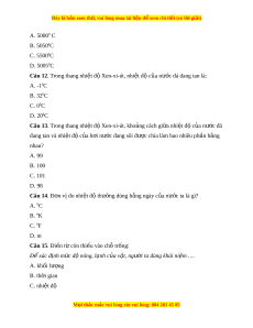 ớ đang sôi được chia làm bao nhiêu ph n b ầ ng ằ nhau? A. 99 B. 100 C. 101 D. 98 Câu 14. Đ n ơ v đo nhi ị t ệ đ t ộ hư ng ờ dùng h ng ngày c ằ a ủ nư c t ớ a là gì? A. 0C B. 0K C. 0F D. m Câu 15. Đi n t ề ừ còn thi u vào ch ế ỗ trống: