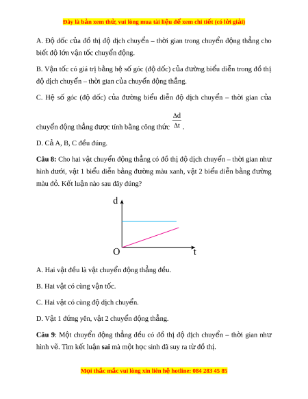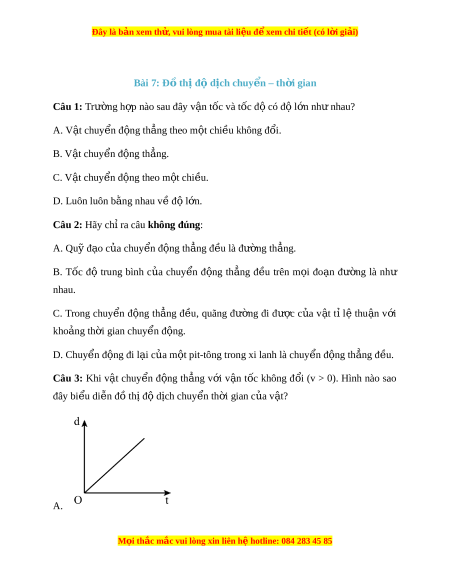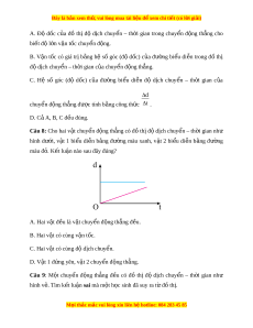 Đây là bản xem th , vu ử i lòng mua tài li u ệ đ xe ể m chi ti t (c ế ó l i ờ gi i ả ) Bài 7: Đồ th đ ị ộ d ch ch ị uy n – t ể h i ờ gian Câu 1: Trư ng h ờ p ợ nào sau đây v n t ậ ốc và tốc đ có đ ộ l ộ n ớ nh nhau? ư A. V t ậ chuy n ể đ ng t ộ h ng t ẳ heo m t ộ chi u không đ ề i ổ . B. V t ậ chuy n đ ể ng t ộ h ng. ẳ C. V t ậ chuy n đ ể ng t ộ heo m t ộ chi u. ề D. Luôn luôn b ng nhau v ằ ề đ l ộ n. ớ