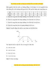 ậ ốc trung bình trên cả quãng đư ng ờ là 0,91 m/s. Câu 6: Chuy n đ ể ng ộ c a m ủ t ộ xe máy được mô t b ả i ở đ t ồ hị Xác đ nh t ị ốc đ và ộ v n t ậ ốc c a xe ủ trong 20 s đ u t ầ iên. A. 1 m/s và 1 m/s. B. 1 m/s và 2 m/s. C. 2 m/s và 1 m/s. D. -1 m/s và 2 m/s. Câu 7: Ch n câu ọ đúng: M i
