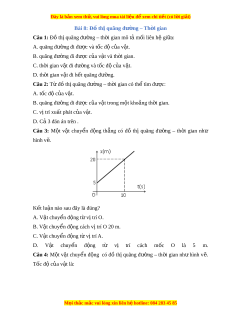ờ gian mô tả mối liên h gi ệ a: ữ A. quãng đư ng đi ờ đư c ợ và tốc đ c ộ a ủ v t ậ . B. quãng đư ng ờ đi đư c c ợ a ủ v t ậ và th i ờ gian. C. th i ờ gian v t ậ đi đư ng và t ờ ốc đ c ộ a ủ v t ậ . D. th i ờ gian v t ậ đi h t ế quãng đư ng ờ . Câu 2: T đ ừ ồ th quãng đ ị ư ng ờ – th i ờ gian có th t ể ìm đư c: ợ A. tốc đ c ộ a v ủ t ậ . B. quãng đư ng ờ đi đư c c ợ a ủ v t ậ trong m t ộ kho ng t ả h i ờ gian. C. vị trí xuất phát c a ủ v t ậ . D. Cả 3 đán án trên . Câu 3: M t ộ v t ậ chuy n ể đ ng ộ th ng