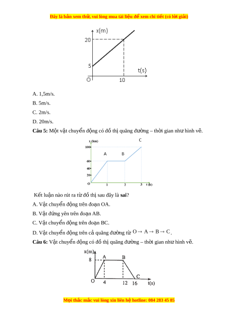 Đây là bản xem th , vu ử i lòng mua tài li u ệ đ xe ể m chi ti t ế (có l i ờ gi i ả ) A. 1,5m/s. B. 5m/s. C. 2m/s. D. 20m/s. Câu 5: M t ộ v t ậ chuy n ể đ ng có đ ộ ồ th quãng ị đư ng – t ờ h i ờ gian nh hì ư nh v . ẽ K t ế lu n nào ậ rút ra t đ ừ t ồ h s ị au đây là sai? A. V t ậ chuy n đ ể ng t ộ rên đo n ạ OA. B. V t ậ đ ng yên ứ trên đo n ạ AB. C. V t ậ chuy n ể đ ng t ộ rên đo n ạ BC. D. V t ậ chuy n đ ể ng t ộ rên cả quãng đư ng t ờ ừ O A B C. Câu 6: V t ậ chuy n đ ể ng có ộ đồ th quãng đ ị ư ng – t ờ h i ờ gian nh hì ư nh v . ẽ M i ọ thắc m c