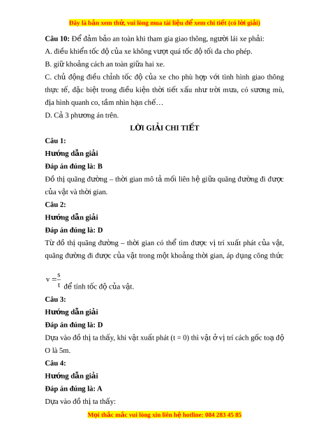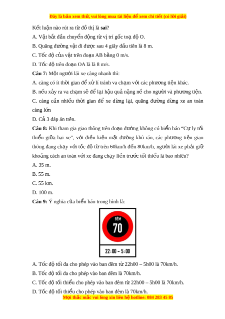 Đây là bản xem th , vu ử i lòng mua tài li u ệ đ xe ể m chi ti t ế (có l i ờ gi i ả ) K t ế lu n nào ậ rút ra t đ ừ t ồ h l ị à sai? A. V t ậ b t ắ đ u chuy ầ n đ ể ng ộ t v ừ t ị rí g c t ố o đ ạ O ộ . B. Quãng đư ng ờ v t ậ đi đư c ợ sau 4 giây đ u t ầ iên là 8 m. C. Tốc đ c ộ a ủ v t ậ trên đo n ạ AB b ng ằ 0 m/s. D. Tốc đ t ộ rên đo n O ạ A là là 8 m/s. Câu 7: M t ộ ngư i ờ lái xe càng nhanh thì: A. càng có ít th i ờ gian đ x ể l ử í tránh va ch m ạ v i ớ các phư ng ơ ti n khác ệ . B. n u x ế y ả ra va ch m ạ sẽ đ l ể i ạ h u ậ qu n ả ng ặ n cho ng ề ư i ờ và phư ng t ơ i n ệ . C. càng c n ầ nhi u ề th i ờ gian để xe d ng ừ l i ạ , quãng đư ng ờ d ng ừ xe an toàn càng l n ớ D. Cả 3 đáp án trên.