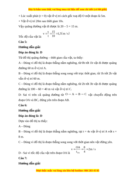 Từ đồ thị quãng đư ng ờ – th i ờ gian có thể tìm đư c ợ vị trí xu t ấ phát c a ủ v t ậ , quãng đư ng ờ đi đư c ợ c a ủ v t ậ trong m t ộ kho ng ả th i ờ gian, áp d ng ụ công th c ứ s v t đ t ể ính tốc đ c ộ a ủ v t ậ . Câu 3: Hư ng ớ d n gi ẫ i ả Đáp án đúng là: D D a vào đ ự ồ th t ị a th y ấ , khi v t ậ xu t ấ phát (t = 0) thì v t ậ v ở t ị rí cách g c t ố o đ ạ ộ O là 5m. Câu 4: Hư ng ớ d n gi ẫ i ả Đáp án đúng là: A D a vào đ ự ồ th t ị a th y: ấ M i ọ thắc m c