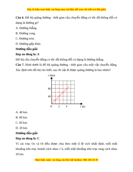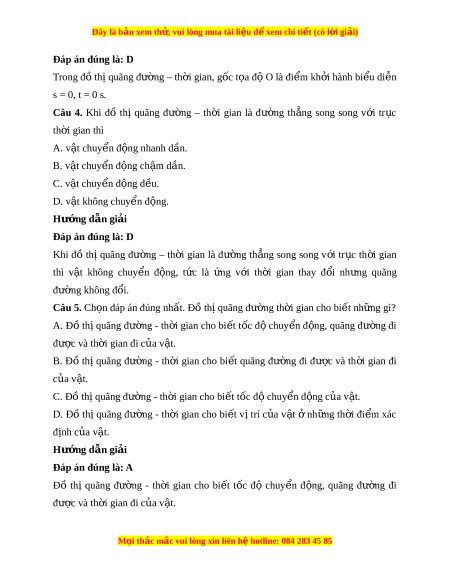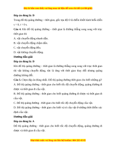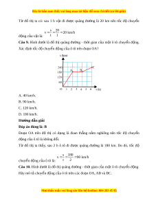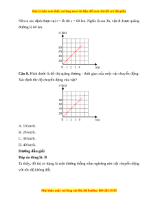 Câu 4. Khi đồ thị quãng đư ng ờ – th i ờ gian là đư ng ờ th ng ẳ song song v i ớ tr c ụ th i ờ gian thì A. v t ậ chuy n đ ể ng nhanh ộ d n. ầ B. v t ậ chuy n đ ể ng ộ ch m ậ d n. ầ C. v t ậ chuy n đ ể ng ộ đ u. ề D. v t ậ không chuy n đ ể ng. ộ Hư ng d ớ ẫn gi i ả Đáp án đúng là: D Khi đồ thị quãng đư ng ờ – th i ờ gian là đư ng ờ th ng ẳ song song v i ớ tr c ụ th i ờ gian thì v t ậ không chuy n ể đ ng, ộ t c ứ là ng ứ v i ớ th i ờ gian thay đ i ổ nh ng ư quãng đư ng ờ không đổi. Câu 5. Ch n ọ đáp án đúng nh t ấ . Đồ th quãng ị đư ng t ờ h i ờ gian cho bi t ế nh ng gì ữ ? A. Đ ồ th ịquãng đư ng ờ - th i ờ gian cho bi t ế t c ố đ ộ chuy n ể đ ng, ộ quãng đư ng ờ đi đư c ợ và th i ờ gian đi c a ủ v t ậ . B. Đồ thị quãng đư ng ờ - th i ờ gian cho bi t ế quãng đư ng ờ đi đư c ợ và th i ờ gian đi c a ủ v t ậ . C. Đồ th quãng đ ị ư ng ờ - th i ờ gian cho bi t ế t c đ ố chuy ộ n đ ể ng c ộ a ủ v t ậ . D. Đồ thị quãng đư ng ờ - th i ờ gian cho bi t ế v ịtrí c a ủ v t ậ ở nh ng ữ th i ờ đi m ể xác định c a ủ v t ậ . Hư ng d ớ ẫn gi i ả Đáp án đúng là: A Đồ thị quãng đư ng ờ - th i ờ gian cho bi t ế t c ố độ chuy n ể đ ng, ộ quãng đư ng ờ đi đư c ợ và th i ờ gian đi c a ủ v t ậ . M i