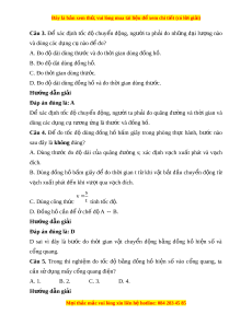 Câu 1. Để đo tốc độ chuy n đ ể ng t ộ a cần sử d ng các d ụ ng ụ c gì ụ ? A. D ng ụ c đo đ ụ dài ộ . B. D ng c ụ đo t ụ h i ờ gian. C. D ng c ụ đo kh ụ ối lư ng. ợ D. C ả A và B. Hư ng d ớ ẫn gi i ả Đáp án đúng là: D s v Vì tốc độ t nên để đo t c ố đ ộ ta c n ầ s ử d ng ụ các d ng ụ c ụ đo đ ộ dài và d ng ụ cụ đo th i ờ gian. Câu 2. D ng ụ cụ dùng để đo t c ố đ ộ c a ủ các phư ng ơ ti n ệ giao thông trên xe máy, ô tô, … g i ọ là gì? A. Đồng hồ. B. Nhi t ệ đ . ộ C. Tốc k . ế D. Thư c ớ đo. Hư ng d ớ ẫn gi i ả Đáp án đúng là: C D ng ụ cụ dùng để đo t c ố đ ộ c a ủ các phư ng ơ ti n