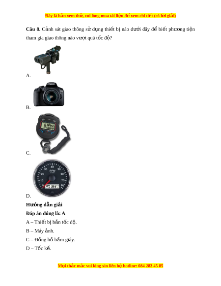 Đây là bản xem th , vu ử i lòng mua tài li u ệ đ xe ể m chi ti t (c ế ó l i ờ gi i ả ) Câu 8. C nh ả sát giao thông sử d ng ụ thi t ế bị nào dư i ớ đây để bi t ế phư ng ơ ti n ệ