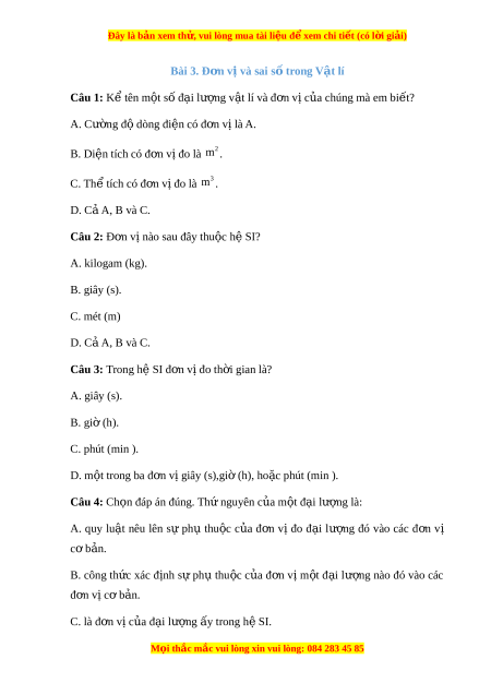 Đây là bản xem th , vu ử i lòng mua tài li u ệ đ xe ể m chi ti t ế (có l i ờ gi i ả ) Bài 3. Đ n v ơ và s ị ai s t ố rong V t ậ lí Câu 1: Kể tên m t ộ số đ i ạ lư ng ợ v t ậ lí và đ n v ơ c ị a ủ chúng mà em bi t ế ? A. Cư ng ờ đ dòng đi ộ n có đ ệ n v ơ l ị à A. B. Di n t ệ ích có đ n v ơ đo l ị à 2 m . C. Th t ể ích có đ n v ơ đo l ị à 3 m . D. Cả A, B và C. Câu 2: Đ n ơ v nào ị sau đây thu c ộ h S ệ I? A. kilogam (kg). B. giây (s). C. mét (m) D. Cả A, B và C.