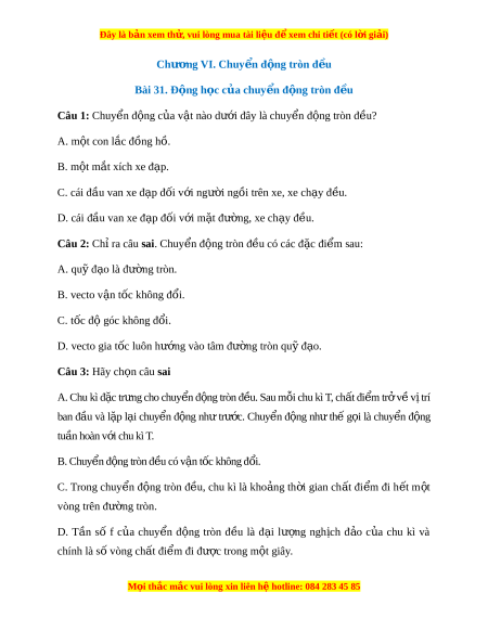 Đây là bản xem th , vu ử i lòng mua tài li u ệ đ xe ể m chi ti t (c ế ó l i ờ gi i ả ) Chư ng ơ VI. Chuy n đ ể ng ộ tròn đ u ề Bài 31. Đ ng h ộ c c ọ a chuy ủ n đ ể ng t ộ ròn đ u ề Câu 1: Chuy n đ ể ng ộ c a v ủ t ậ nào dư i ớ đây là chuy n ể đ ng t ộ ròn đ u? ề A. m t ộ con l c đ ắ ng h ồ . ồ B. m t ộ m t ắ xích xe đ p. ạ C. cái đ u van xe đ ầ p ạ đ i ố v i ớ ngư i ờ ng i ồ trên xe, xe ch y ạ đ u. ề D. cái đầu van xe đ p đ ạ ối v i ớ m t ặ đư ng, ờ xe ch y ạ đ u. ề
