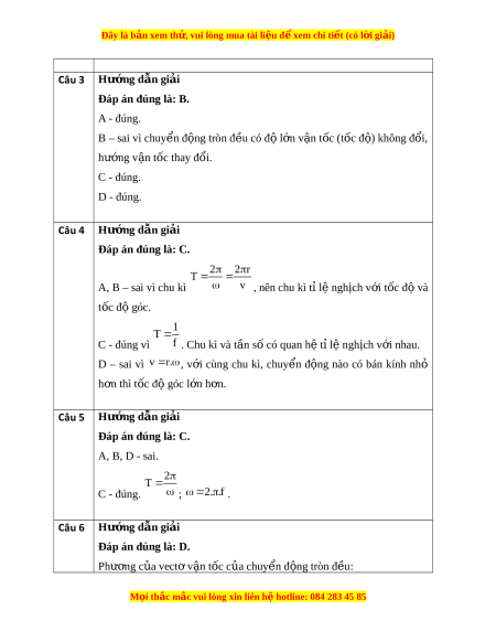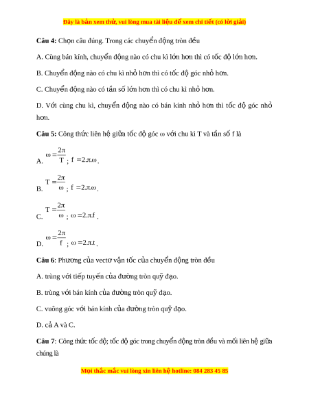 Đây là bản xem th , vu ử i lòng mua tài li u ệ đ xe ể m chi ti t (c ế ó l i ờ gi i ả ) Câu 4: Ch n câu ọ đúng. Trong các chuy n đ ể ng ộ tròn đ u ề A. Cùng bán kính, chuy n đ ể ng nào ộ có chu kì l n h ớ n t ơ hì có t c đ ố l ộ n h ớ n. ơ B. Chuy n đ ể ng ộ nào có chu kì nh h ỏ n t ơ hì có t c đ ố góc ộ nh h ỏ n. ơ C. Chuy n đ ể ng ộ nào có t n s ầ ố l n h ớ n t ơ hì có chu kì nh h ỏ n. ơ D. V i ớ cùng chu kì, chuy n ể đ ng