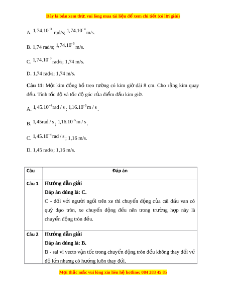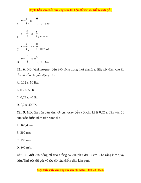 Đây là bản xem th , vu ử i lòng mua tài li u ệ đ xe ể m chi ti t (c ế ó l i ờ gi i ả ) s θ v ω = A. t ; t ; v r . . θ s v = B. t ; t ; v .r s θ v ω = C. t ; t ; v .r . θ s v = D. t ; t ; v r .. Câu 8: M t ộ bánh xe quay đ u ề 100 vòng trong th i ờ gian 2 s. Hãy xác đ nh ị chu kì, tần số c a ủ chuy n đ ể ng t ộ rên. A. 0,02 s; 50 Hz. B. 0,2 s; 5 Hz. C. 0,02 s; 40 Hz. D. 0,2 s; 40 Hz. Câu 9: M t