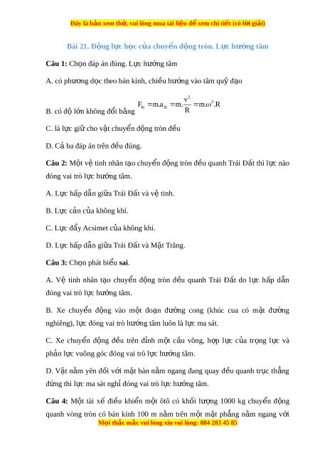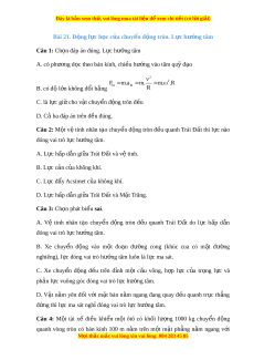 Đây là bản xem th , vu ử i lòng mua tài li u ệ đ xe ể m chi ti t ế (có l i ờ gi i ả ) Bài 21. Đ ng l ộ c h ự c ọ c a ch ủ uy n đ ể ng t ộ ròn. L c h ự ư ng t ớ âm Câu 1: Ch n ọ đáp án đúng. L c h ự ư ng ớ tâm A. có phư ng d ơ c ọ theo bán kính, chi u h ề ư ng ớ vào tâm qu đ ỹ o ạ 2 2 F m .a m . m . .R B. có độ l n không đ ớ ổi b ng ằ ht ht R C. là l c ự giữ cho v t ậ chuy n ể đ ng t ộ ròn đ u ề