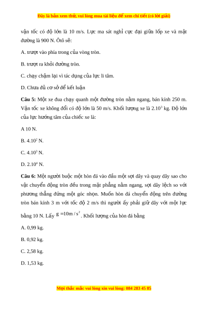 Đây là bản xem th , vu ử i lòng mua tài li u ệ đ xe ể m chi ti t (c ế ó l i ờ gi i ả ) v n ậ tốc có độ l n ớ là 10 m/s. L c ự ma sát nghỉ c c ự đ i ạ gi a ữ l p ố xe và m t ặ đư ng ờ là 900 N. Ôtô s : ẽ A. trư t
