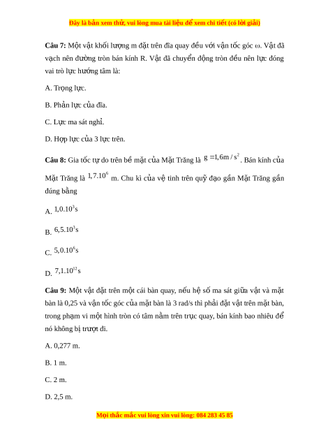Đây là bản xem th , vu ử i lòng mua tài li u ệ đ xe ể m chi ti t ế (có l i ờ gi i ả ) Câu 7: M t ộ v t ậ khối lư ng m ợ đ t ặ trên đĩa quay đ u v ề i ớ v n t ậ c góc ố . V t ậ đã v ch ạ nên đư ng ờ tròn bán kính R. V t ậ đã chuy n ể đ ng ộ tròn đ u ề nên l c ự đóng vai trò l c ự hư ng t ớ âm là: A. Tr ng l ọ c. ự B. Ph n ả l c c ự a đĩ ủ a. C. L c m ự a sát nghỉ. D. H p l ợ c c ự a ủ 3 l c t ự rên. 2 Câu 8: Gia tốc t ự do trên b ề m t ặ c a ủ M t ặ Trăng là g 1 ,6m / s . Bán kính c a ủ 6 M t