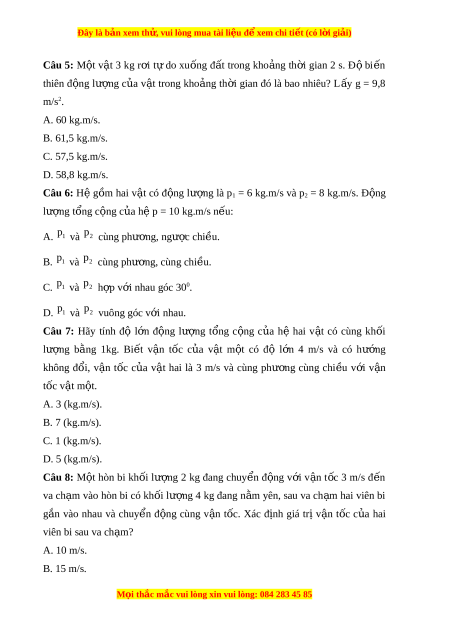 Đây là bản xem th , vu ử i lòng mua tài li u ệ đ xe ể m chi ti t (c ế ó l i ờ gi i ả ) Câu 5: M t ô v t â 3 kg r i ơ t ư do xu ng ô đ t â trong kho ng a th i ơ gian 2 s. Đ ô bi n ê thiên đ ng ô lư ng ơ c a u v t â trong kho ng a th i ơ gian đo la bao nhiêu? L y â g = 9,8 m/s2. A. 60 kg.m/s. B. 61,5 kg.m/s. C. 57,5 kg.m/s. D. 58,8 kg.m/s.