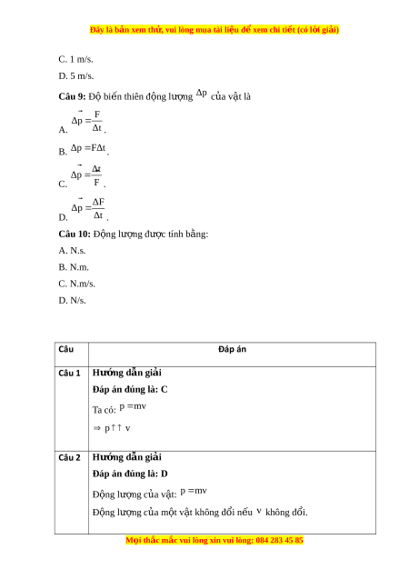 Đây là bản xem th , vu ử i lòng mua tài li u ệ đ xe ể m chi ti t ế (có l i ờ gi i ả ) C. 1 m/s. D. 5 m/s. Câu 9: Đô bi n t ê hiên đ ng l ô ư ng ơ Δp c a u v t â la F Δp A. Δt . B. Δp F Δt . Δt Δp C. F . ΔF Δp D. Δt . Câu 10: Đ ng ô lư ng đ ơ ư c ơ tinh b ng: ă A. N.s. B. N.m. C. N.m/s. D. N/s. Câu Đáp án Câu 1 Hư ng ớ d n gi ẫ i ả Đáp án đúng là: C Ta co: p m v p v Câu 2 Hư ng ớ d n gi ẫ i ả Đáp án đúng là: D Đ ng l ô ư ng c ơ a u v t â : p m v Đ ng l ô ư ng c ơ a u m t ô v t â không đ i ô n u ê v không đôi. M i