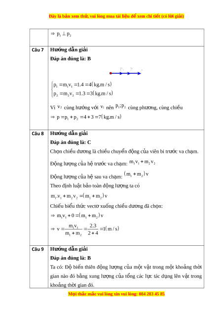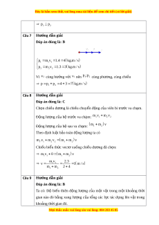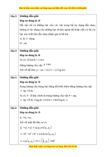 Đây là bản xem th , vu ử i lòng mua tài li u ệ đ xe ể m chi ti t (c ế ó l i ờ gi i ả ) Câu 3 Hư ng d ớ ẫn gi i ả Đáp án đúng là: D Hê v t â chi co nh ng ư l c ư c a u cac v t â trong hê tac d ng u l n ẫ nhau, không co tac d ng u c a u nh ng ư l c ư t ư bên ngoai h ê ho c ặ n u ê co thi cac l c ư nay tri t ê tiêu l n nhau đ ẫ ư c g ơ i o la h ki ê n. A, B, C- đung D - sai Câu 4 Hư ng d ớ ẫn gi i ả Đáp án đúng là: B Ta co: 18 km/h = 5 m/s Đ ng ô lư ng c ơ a v u t â : p m v Xet vê đ l ô n: ơ p = mv = 0,5.5 = 2,5 kg.m/s Câu 5 Hư ng d ớ ẫn gi i ả Đáp án đúng là: D Xung lư ng ơ c a t u r ng l o c b ư ng ă đ bi ô n t ê hiên đ ng l ô ư ng ơ c a v u t â : Δp F .Δt Ta co: F - đây chi ở nh la tr ng l o ư ng ơ c a v u t â P = mg Δp P .Δt m g.Δt 3 .9,8.2 5 8,8 kg.m / s Câu 6 Hư ng d ớ ẫn gi i ả Đáp án đúng là: D p p p t 1 2 Xet vê m t ặ đ l ô n, t ơ a co: 2 2 2 p p p 2p p cos p , p t 1 2 1 2 1 2 2 2 2 10 6 8 2.6.8.cos p ,p 1 2 cos p ,p 0 p ,p 0 9 0 1 2 1 2 M i ọ thắc m c