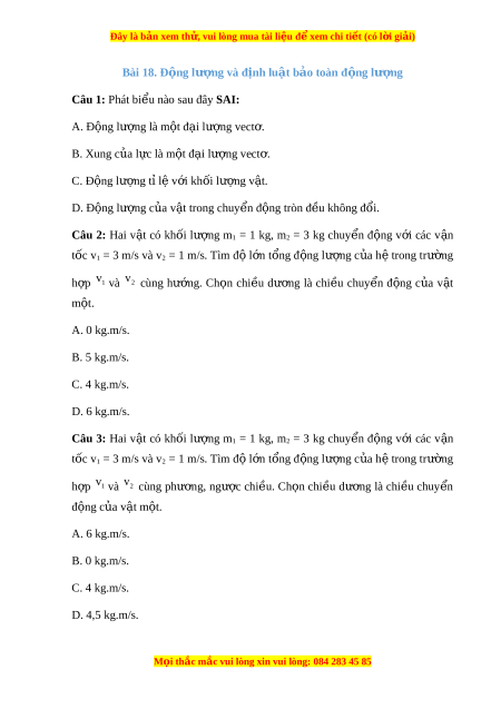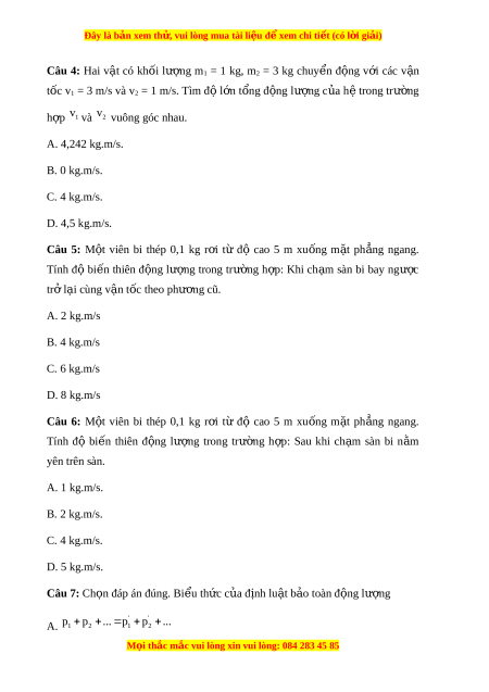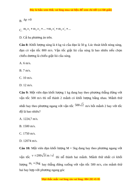 Đây là bản xem th , vu ử i lòng mua tài li u ệ đ xe ể m chi ti t ế (có l i ờ gi i ả ) B. p 0 ' ' C. m . m . ... m . m . ... 1 1 2 2 1 1 2 2 D. Cả ba phư ng án ơ trên. Câu 8: Kh i ố lư ng ợ súng là 4 kg và c a ủ đ n ạ là 50 g. Lúc thoát kh i ỏ nòng súng, đ n ạ có v n ậ t c ố 800 m/s. V n ậ t c ố gi t ậ lùi c a ủ súng là bao nhiêu n u ế ch n ọ chi u d ề ư ng l ơ à chi u gi ề t ậ lùi c a s ủ úng. A. 6 m/s. B. 7 m/s. C. 10 m/s. D. 12 m/s. Câu 9: M t ộ viên đ n ạ kh i ố lư ng