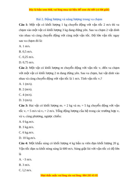 Đây là bản xem th , vu ử i lòng mua tài li u ệ đ xe ể m chi ti t ế (có l i ờ gi i ả ) Bài 2. Đ ng l ộ ư ng và năng l ợ ư ng t ợ rong va ch m ạ Câu 1: M t ộ v t ậ có kh i ố lư ng ợ 1 kg chuy n ể đ ng ộ v i ớ v n ậ t c ố 2 m/s thì va ch m ạ vào m t ộ v t ậ có kh i ố lư ng ợ 3 kg đang đ ng ứ yên. Sau va ch m ạ 2 v t ậ dính vào nhau và cùng chuy n ể đ ng ộ v i ớ cùng m t ộ v n ậ t c. ố Độ l n ớ v n ậ t c ố ngay sau va ch m ạ đó là: A. 1 m/s. B. 0,5 m/s. C. 0,25 m/s. D. 0,75 m/s. Câu 2: M t ộ v t ậ có kh i ố lư ng ợ m chuy n ể đ ng ộ v i ớ v n ậ t c ố v1 đ n ế va ch m ạ v i ớ m t ộ v t ậ có kh i ố lư ng ợ 2 m đang đ ng ứ yên. Sau va ch m ạ , hai v t ậ dính vào nhau và cùng chuy n ể đ ng v ộ i ớ v n