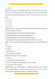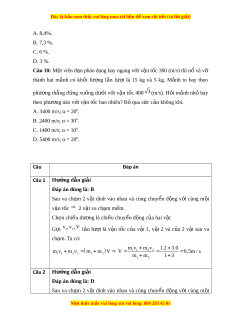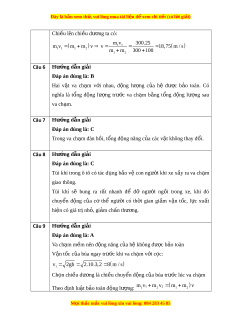 ậ dính vào nhau và cùng chuy n ể đ ng ộ v i ớ cùng m t ộ v n t ậ ốc 2 v t ậ va ch m ạ m m ề . Ch n chi ọ u ề dư ng l ơ à chi u chuy ề n ể đ ng c ộ a ủ hai v t ậ G i ọ v ,v ,V 1 2 lần lư t ợ là v n ậ t c ố c a ủ v t ậ 1, v t ậ 2 và c a ủ 2 v t ậ sau va ch m ạ . Ta có: m v m v 1.2 3.0 m v m v m m 1 1 2 2 V V 0 ,5m / s 1 1 2 2 1 2 m m 1 3 1 2 Câu 2 Hư ng ớ d n gi ẫ i ả Đáp án đúng là: D Sau va ch m ạ 2 v t